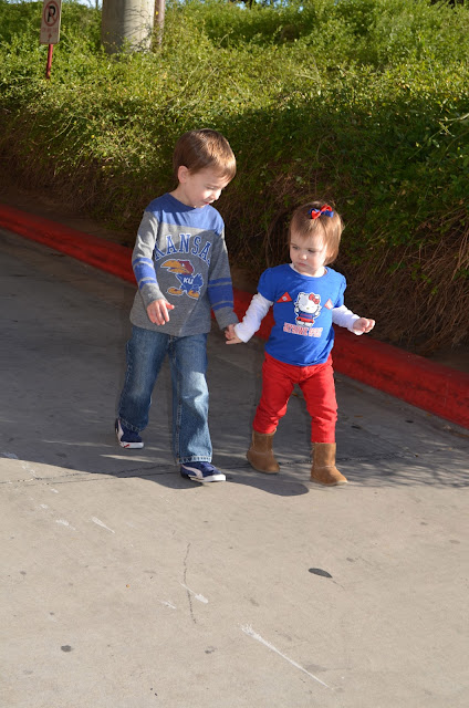 After the short drive (3 hours), we arrived in Austin just in time to grab some lunch and head straight to the arena. We had incredible seats and the kids did amazing! The game started at 1, the exact time we put them down for naps everyday. Despite the 16,000 semi-loud fans, we got Laney asleep most of the first half. She was up for the second half but totally content on our laps. Very unLaney like, I was prepared with lots of toys and snacks, but didn't need anything! She was taking it all in-the game, the crowd, the LED boards with all the lights. She would point to the court and say, ba-ball. She is very familiar with basketball since her brother asks her to play every single day. We are pretty sure she loved her first KU basketball experience. :) Cooper loved it as we thought he would. He was always on the lookout for Jeff Withey and Ben McClemore. He was cheering and mad at all the right times :). However, he did tell me about every 3 minutes how tired he was, but he refused to rest. We didn't buy anything!! and only got up once, can you believe it??!! That one time was for me to take Coop to the bathroom with 4 minutes left when we were still down!!!!!! But we came back from the bathroom after we had finally taken the lead again. It wasn't the prettiest game and was way too close for comfort (if my kids didn't soak in any new inappropriate words it will be a miracle ;)) but all that matters is our Hawks got the W.