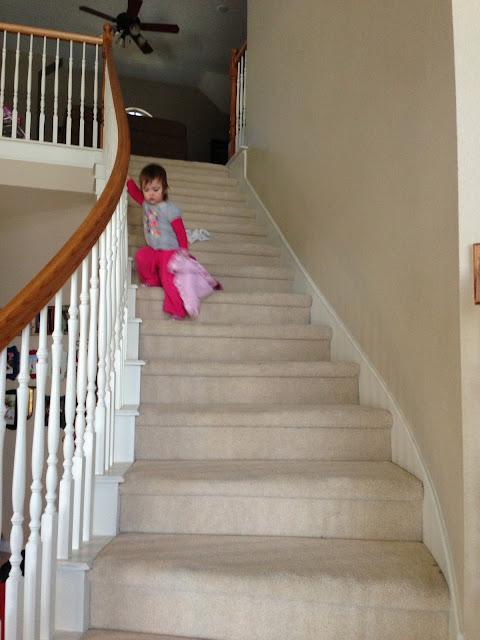 Here she is maneuvering the stairs. This time she had went up while I was making lunch to get her lovey from the crib. This makes me crazy-hold-my-breath-nervous.