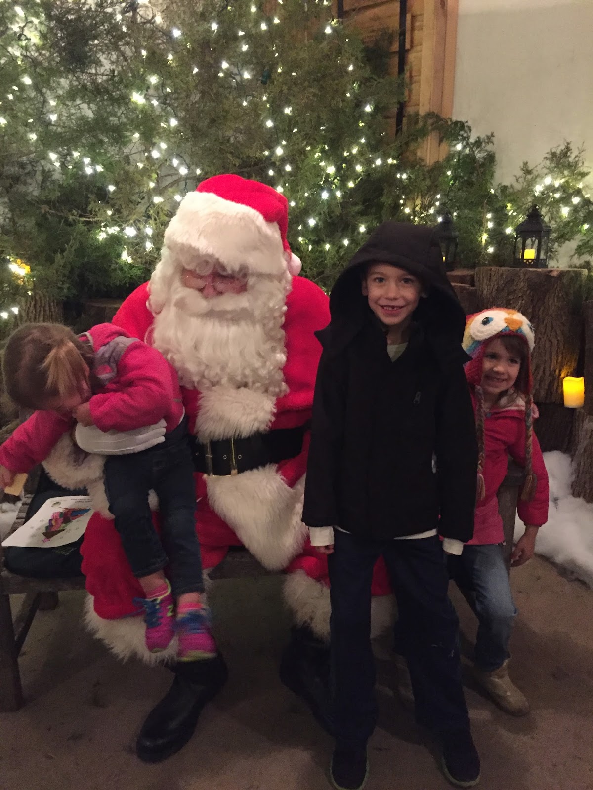 For a second year in a row we went to the luminary walk at the Arboretum. They line the walking trail with tons of candles, have a fire to sing Christmas carols around, a hayride and SANTA! We got to the park and realized that Laney left her coat at home...so she's wearing mine here.